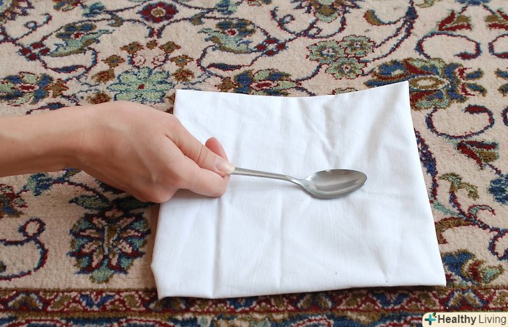 Масажуйте ганчірку, за допомогою дна ложки. Дном ложки обережно натисніть на тканину. Поступово працюйте над усім плямою, починаючи з її зовнішньої сторони і просуваючись до центру по спіралі, щоб запобігти поширенню плями. Не втирайте розчин в килим, це може пошкодити структуру його волокон.