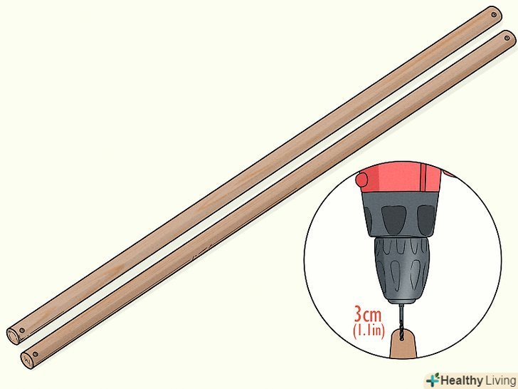 Розпиляйте шматок дерев'яного стрижня на дві однакові половини. просвердлите на кінцях стрижня 8-мм Отвори на відстані 1,1 см від кінців.