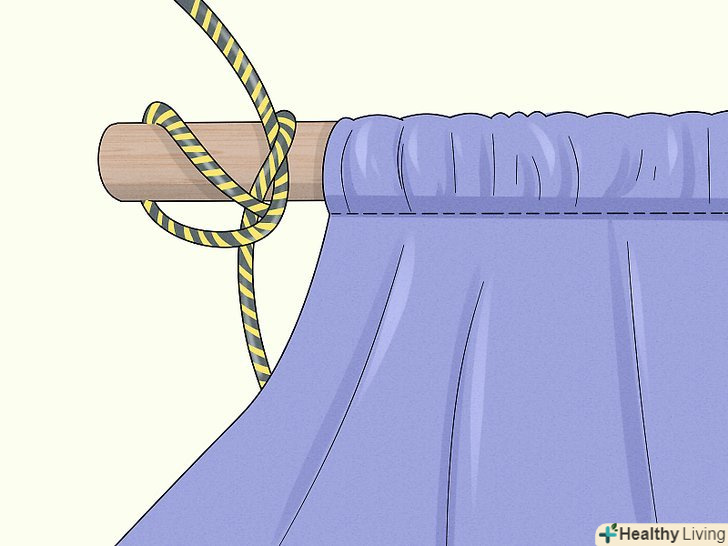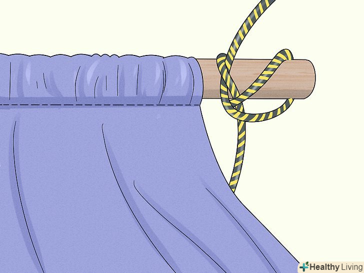Зробіть те ж саме на стороні з дугою. розріжте мотузку навпіл, а потім обмотайте кінці навколо стрижня на одній третині і двох третинах його довжини. Зробіть відкриту петлю як описано вище, протягніть інший кінець мотузки і затягніть її.- Ви також можете не створювати петлю. Замість цього, затягніть великі вузли в місцях отворів на стрижнях, щоб запобігти прослизання мотузки, а потім обв'яжіть вільні кінці навколо великого об'єкта, наприклад, пня, або повісьте на кріплення для гамака, прикріплені до стовпів веранди і т. п.