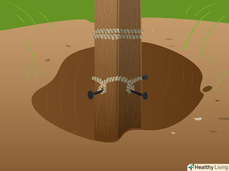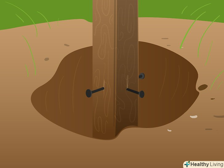 Забийте цвяхи. вбийте чотири цвяхи з кожної сторони стовпа. Забийте цвяхи приблизно на висоті 30 см від рівня землі. Постарайтеся забити в дерево не менше половини цвяха, щоб він міцно тримався.