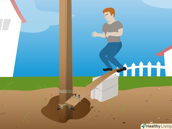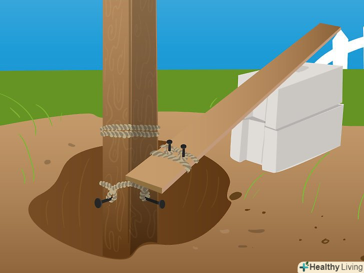 Прикріпіть мотузку до кінця дошки, найближчої до стовпа. вбийте пару цвяхів в дошку, щоб забезпечити надійне кріплення мотузки до дошки.