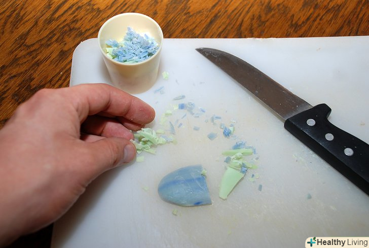 Наріжте мило на дрібні шматочки. чим дрібніше, тим краще. Придбані в магазині мильні пластівці теж можна використовувати.