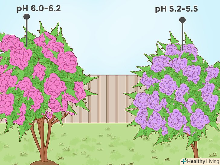 Знижуйте рН для таких квітів, як петунія або бегонія. багато яскраво квітучі рослини, такі як петунія і бегонія, краще ростуть на кислих грунтах. Для деяких з цих кольорів зміни кислотності від слабокислою до дуже кислої може привести до видимого зміни забарвлення квіток. Наприклад, якщо ви вирощуєте гортензію на ділянці, де рівень рН грунту дорівнює 6,0-6,2, то на рослині розпустяться рожеві квіти. Якщо ж ви знизите рН до 5,0-5,2, то у вас виростуть квіти з блакитними або ліловими пелюстками. [17]- Блакитний колір пелюсток гортензії, вирощеної при низьких значеннях рН грунту, обумовлений солями алюмінію. Коли грунт кислий, рослина набагато легше засвоює алюміній з субстрату, що позначається на забарвленні її пелюсток. [18]