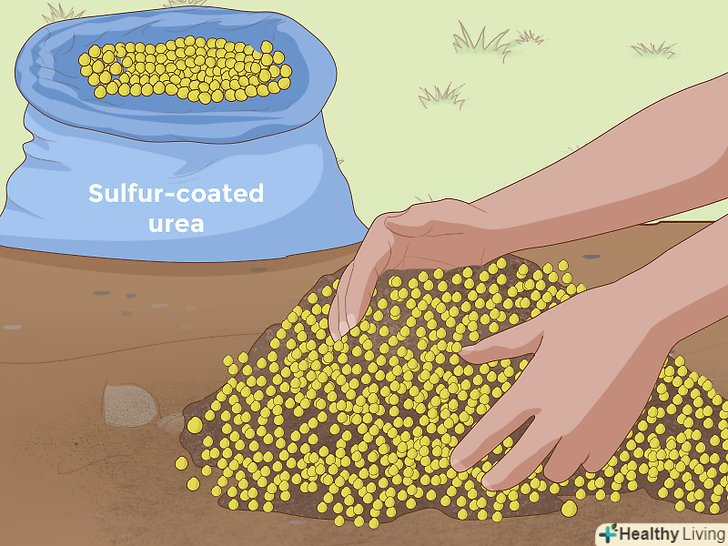 Додайте гранульовану сечовину, покриту сіркою. як і сульфат алюмінію і сірка, грунтові добавки, що містять сечовину, покриту сіркою, можуть поступово підвищувати кислотність (знижувати її рН). Добавки, що містять сечовину, діють досить швидко, і ефект починає з'являтися через 1-2 тижні після внесення речовини в грунт. [12] Сечовина, покрита сіркою, - це звичайний інгредієнт багатьох добрив, тому якщо ви плануєте підгодувати свої рослини добривами, то можете уникнути зайвих витрат часу і грошей на цю добавку, і відразу вибрати добриво, який містить в собі цю речовину.- Вміст сечовини, покритої сіркою, відрізняється в залежності від обраного типу добрив, тому уважно вивчіть інструкцію до удобрення, щоб визначити, яка кількості речовини буде необхідно для потреб вашого саду.
