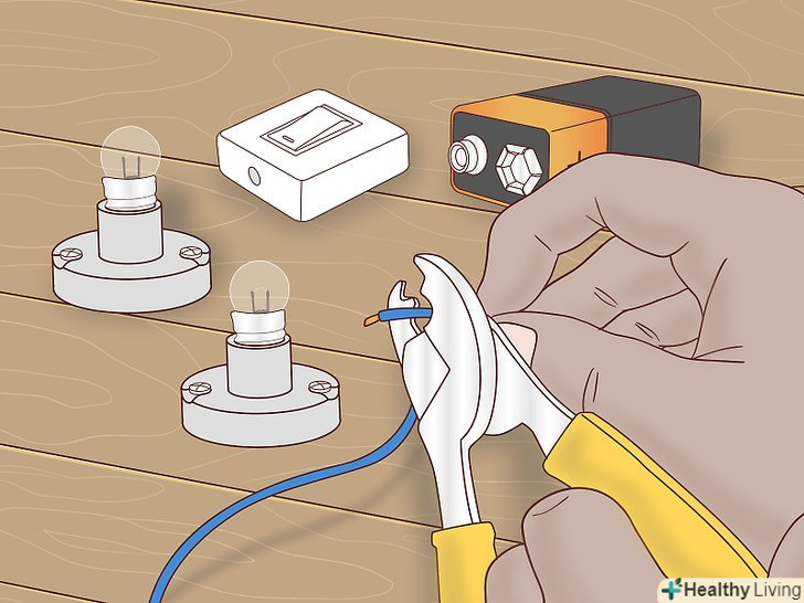 Виберіть даний метод в якості ускладненого проекту. незважаючи на те, що створення паралельного ланцюга є нескладним завданням, в даному випадку вам буде потрібно мати при собі дроти і вимикач. Цей метод підійде для учнів старшого віку.- Даний метод має на увазі зачистку кінців проводів, але якщо у вас немає для цього спеціального інструменту (стриппера), або якщо ви не хочете довіряти цю роботу дітям, то можете звернутися до вищевказаного спрощеного методу.