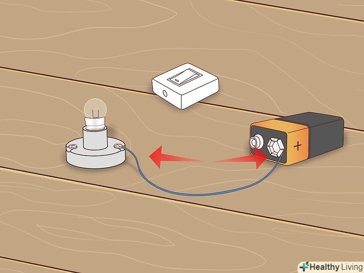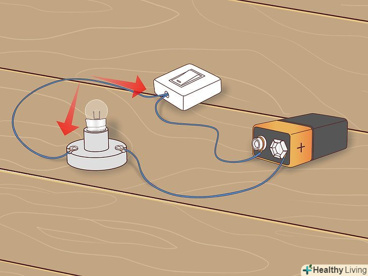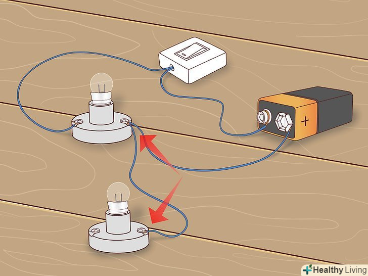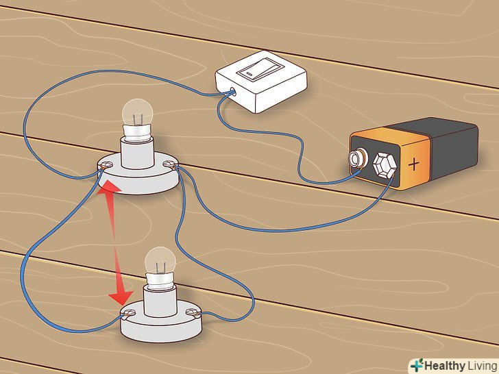 Приєднайте вимикач до першої лампочки. взявши інший шматок дроту, приєднайте його спочатку до вимикача, а потім до правої сторони першої лампочки. [7]