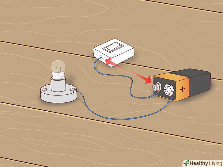 Почніть приєднувати вимикач до батареї. візьміть інший шматок дроту і приєднайте його одним кінцем до мінуса батареї. Другий його кінець підключіть до вимикача. [6]