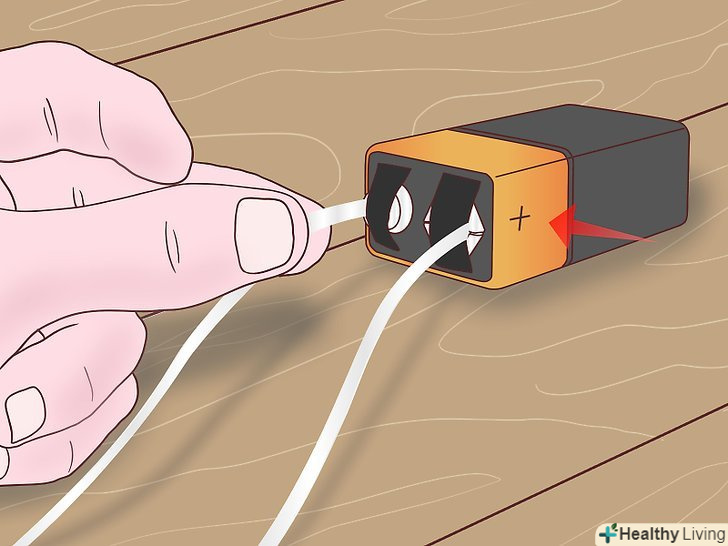 Приєднайте першу лампочку до батареї. Підключіть один з проводів до плюса на батареї і примотати другий його кінець до лівої сторони однієї з лампочок. [5]