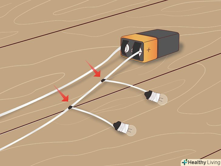 Завершіть створення паралельного електроланцюга. взявши останній шматок дроту, приєднайте його одним кінцем до правої сторони першої лампочки, а другий кінець прикріпіть до правої сторони другої лампочки.