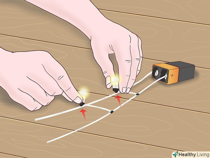 Замкніть паралельну електричну ланцюг. коли ви закінчите з'єднувати всі елементи паралельної ланцюга, ваші лампочки почнуть світитися.- Прикладіть лампочки до другої довгій смузі фольги, що йде від мінуса батареї.