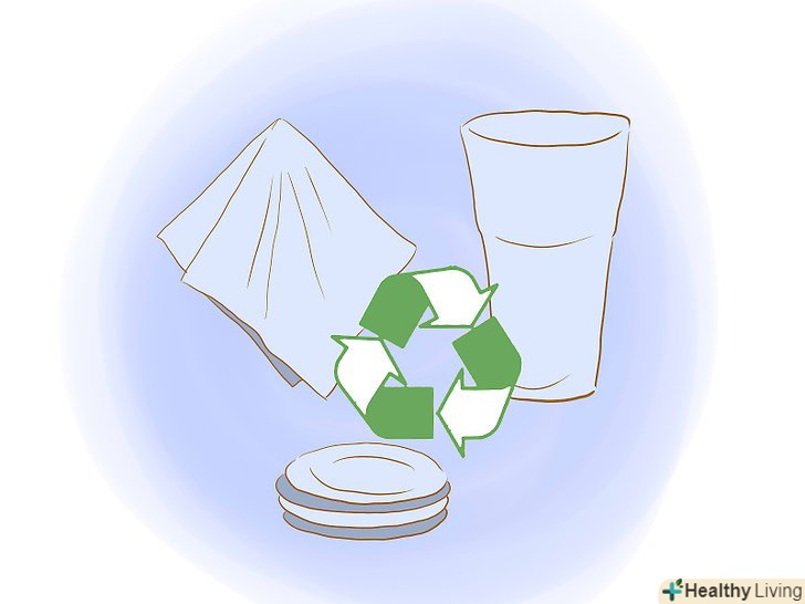Не використовуйте одноразову продукцію і не викидайте корисні предмети. предмети одноразового використання заповнюють звалища і створюють сміття на вашій території. Є відповідні альтернативи:- Обзаведіться предметами повторного використання, такими, як тканинні серветки, скляні склянки, керамічні тарілки і все для організації харчування.