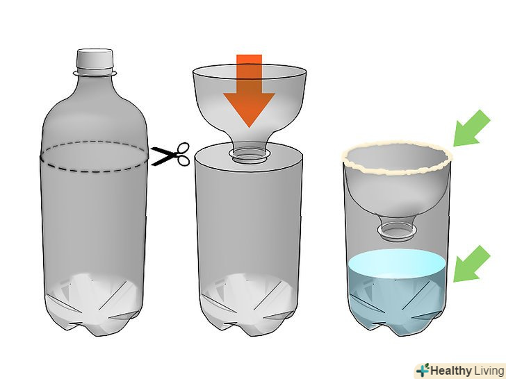 Зробіть пастку самостійно, використовуючи велику пластикову пляшку. відріжте 1/3 верху 2-літрової пластикової пляшки. Переверніть верх, щоб горлечко було направлено вниз, і закріпіть в залишилася частини пляшки. У вас повинна вийти пастка з лійкою всередині.- Заповніть пляшку приблизно наполовину мильним розчином. Покрийте горловину солодким варенням. Хижі оси спробують дістатися до варення і впадуть в пляшку, з якої дуже важко вибратися.