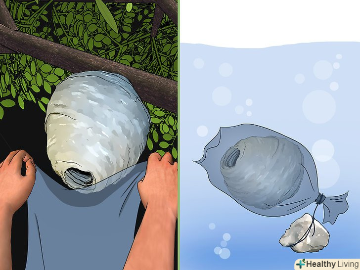 Утилізуйте осине гніздо в мішку з тканини. вночі, коли оси Сонні, підкрадіться до гнізда і швидко обхопіть його мішком. Ретельно зав'яжіть мішок, щоб оси не могли вибратися. Відірвіть гніздо від кріплення і повністю занурте в воду, щоб оси потонули. Притисніть гніздо камінням, щоб воно не спливло.