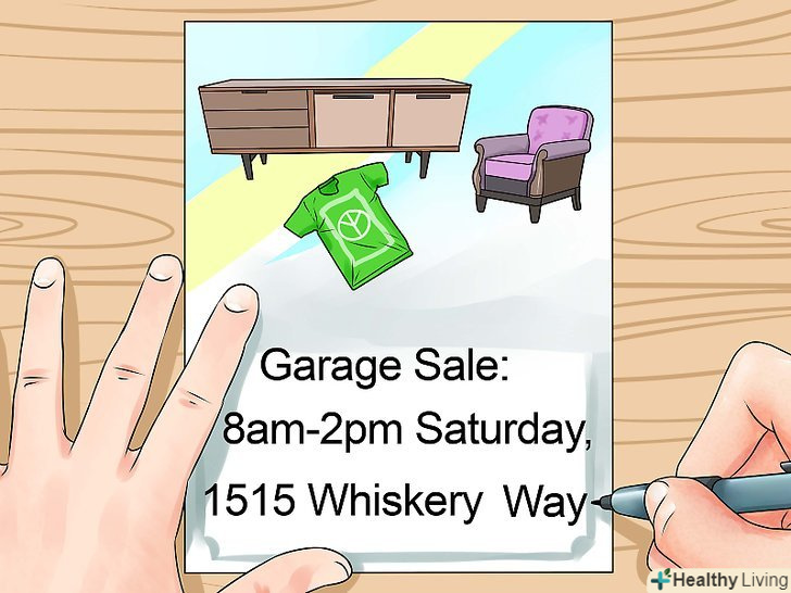 Зробіть афішіЗа кілька днів до розпродажу. вкажіть дату і час, місце і деякі позиції (якщо залишиться місце).- Досить вказати "розпродаж з 8 до 14 в суботу, вулиця Виноградна, будинок 7" або "великий розпродаж в суботу на виноградній, 7" і помістити стрілку в напрямку вашого будинку.