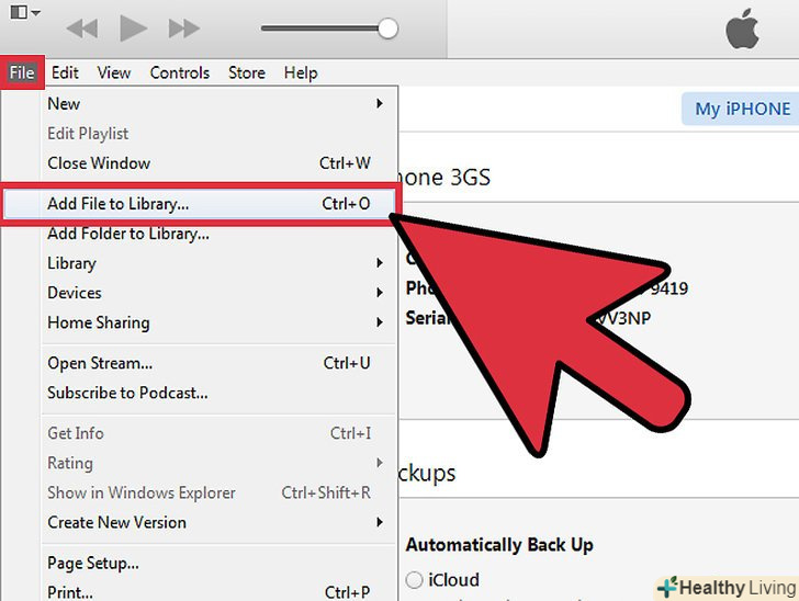 Перемістіть відео на телефон iPhone.відкрийте iTunes. Натисніть Файл, потім Додати Файл до бібліотеки ... знайдіть потрібне відео. Або просто перетягніть його в потрібну папку.- Синхронізуйте свій iPhone.