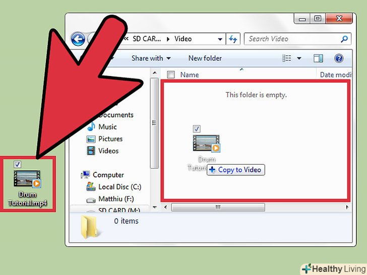 Перемістіть відео на пристрій Android.знайдіть диск з пристроєм. В системі Windows відкрийте Мій комп'ютер, натисніть на букву диска. У Mac OS X відкрийте finder і виберіть пристрої (Devices).- Знайдіть відео на комп'ютері. Відкрийте папку Videos на телефоні. Перетягніть туди відео.