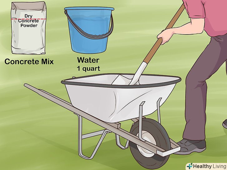 Змішайте цемент з водою. для початку візьміть велику ємність, наприклад, тачку, і насипте в неї приблизно третину бетонної суміші. Потім налийте в тачку десь літр води і ретельно все перемішайте сапкою, лопатою або лопатевої мішалкою. Продовжуйте додавати воду, поки весь бетон не намокне і не перетвориться в однорідну суміш. Додайте гравію, щоб збільшити міцність бетону. [8]- Бетонну суміш в мішках по 50 кг можна купити в місцевому будівельному магазині.