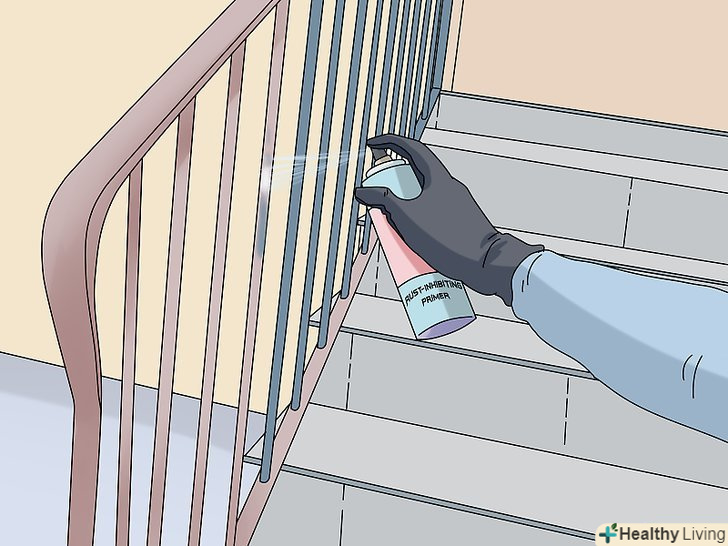 Нанесіть на чисті перила шар антикорозійної грунтовки. виберіть спеціально призначену для металу водостійку грунтовку. У продажу є як розпилювана , так і рідка грунтовка. Ґрунтовку у вигляді аерозолю легше наносити на декоративні перила з великою кількістю вигинів і поглиблень. Спочатку за допомогою валика для фарби покрийте рідкої ґрунтовкою широкі ділянки, потім розпорошите ґрунтовку в більш важкодоступних місцях. [10]- Якщо ви використовуєте грунтовку у вигляді аерозолю, тримайте балончик приблизно в 15 сантиметрах над поручнями. Розпилюйте грунтовку плавними рухами з боку в бік. Це більш швидкий спосіб покрити перила ґрунтовкою, проте будьте уважні, щоб не пропустити будь-які ділянки!