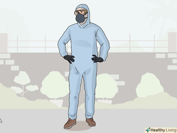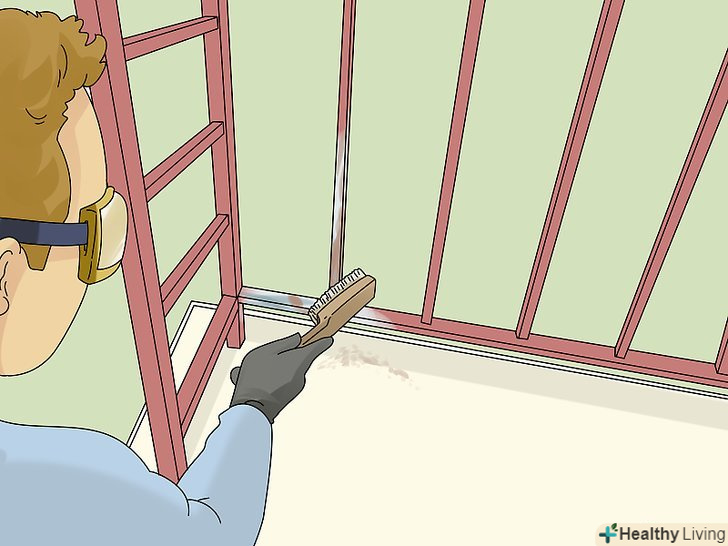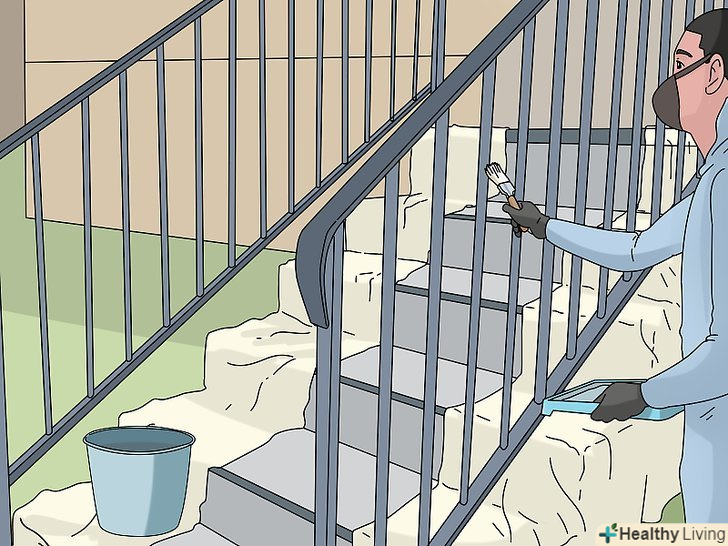 Одягніть респіратор, захисні окуляри і відповідний одяг. використовуйте одяг з довгими рукавами і штанинами, щоб захистити шкіру від металевої стружки, коли будете чистити перила. Використовуйте ті ж захисні засоби під час фарбування перил. [2]- Врахуйте, що старі перила можуть бути покриті свинцевою фарбою, яка дуже токсична (наприклад, в США її заборонили лише в 1978 році). Якщо ви підозрюєте, що маєте справу зі свинцевою фарбою, обов'язково надіньте респіратор, рукавички і захисний комбінезон, призначений для роботи з подібними фарбами.