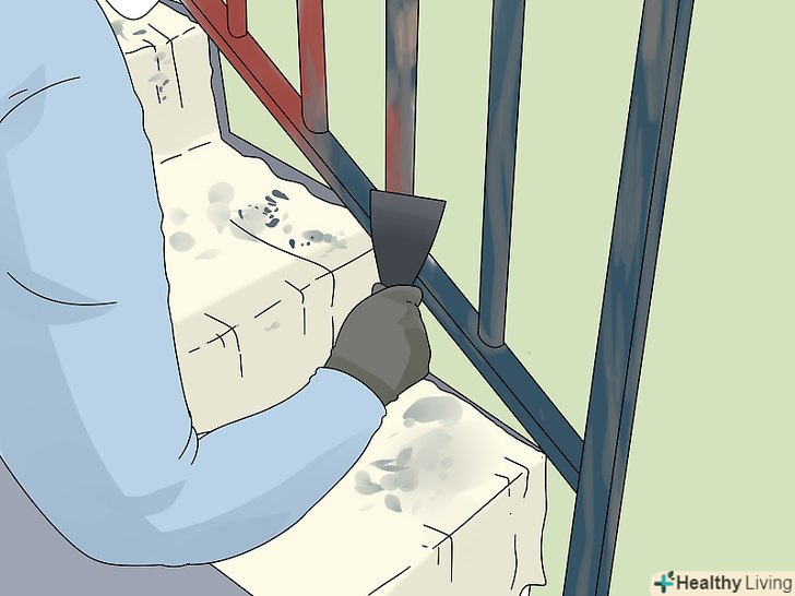Використовуйте металевий скребок, щоб видалити стару фарбу та іржу. немає необхідності знімати всю стару фарбу, щоб оголити металеву поверхню. Якщо в окремих місцях залишився міцний рівний шар старої фарби, нову фарбу можна нанести поверх нього. Однак постарайтеся якомога краще видалити іржу. Якщо ви покриєте іржу свіжою фарбою, це не зупинить її подальше поширення. [3]- Необхідно позбутися від відсталою старої фарби і іржі. Якщо ви просто завдасте на подібні місця нову фарбу, вона потріскається. При необхідності використовуйте більш жорсткі інструменти, наприклад дротяну щітку.