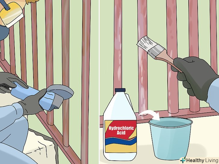 Обробіть важкі плями іржі електроінструментами абоХімікатами . якщо вам не вдається видалити іржу вручну, спробуйте інші способи: наприклад, використовуйте електродриль з дротяною щіткою. Така щітка являє собою насадку на дриль у вигляді кола з дроту. Можна також використовувати кутову або іншу ручну шліфувальну машину. Якщо і цього виявиться недостатньо, спробуйте видалити іржу за допомогою кислоти. [5]- Часто для усунення плям іржі використовують фосфорну або соляну кислоту. Придбайте трохи кислоти в магазині господарських товарів і нанесіть її на іржу. Коли кислота розчинить іржу, зішкребіть її.