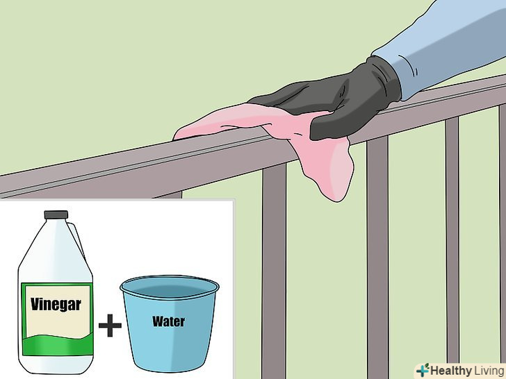 Ретельно протріть перила водним розчином оцту. змішайте в відрі рівні частини води і білого оцту. Перемішайте розчин і змочіть їм чисту м'яку ганчірку. Протріть всю поверхню поручнів, щоб видалити з них пил, металеву стружку та інше сміття. Фарбу слід наносити на чисті перила. [7]- Якщо у вас немає оцту, додайте у воду звичайний рідкий засіб для миття посуду. Спробуйте розвести приблизно 4 чайні ложки (20 мілілітрів) кошти в 4 літрах води.