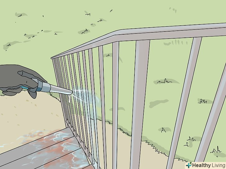 Вимийте перила чистою водою, щоб видалити все сміття. Обдайте перила водою з садового шланга, а якщо немає такої можливості, витріть їх чистою ганчіркою. Видаліть залишки мила, оцту та сміття. Перевірте, чи не потрібно ще раз пошкребти, а потім вимити окремі місця. [8]- Подивіться, чи не залишилося відсталою фарби або іржі. Ви могли випустити з уваги окремі місця. При необхідності почистіть перила ще раз.