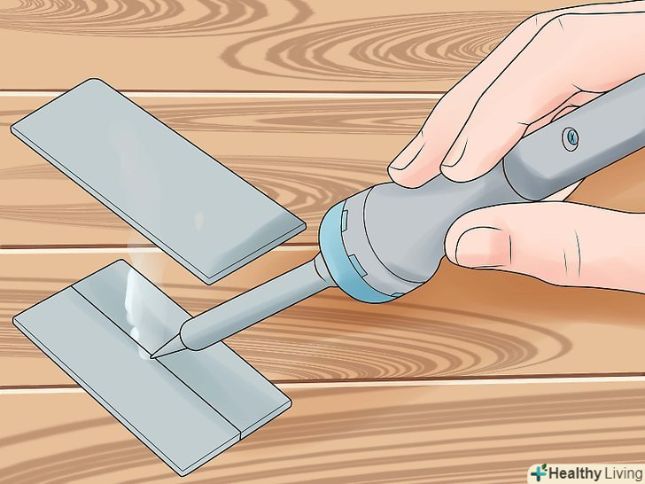 Розігрійте метал. за допомогою пальника або паяльника нагрійте місце стику, починаючи від далеких кінців. При безпосередньому контакті з нагрівальним приладом припій і флюс можуть перегрітися. Якщо Ви користуєтеся пальником, тримайте її сопло на відстані не менше 10-15 см від металу. [3] плавними круговими рухами переміщайте джерело нагріву уздовж металу, рівномірно розігріваючи його.- Перед використанням розігрійте паяльник протягом десяти хвилин.