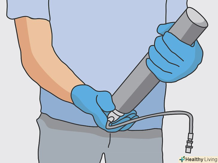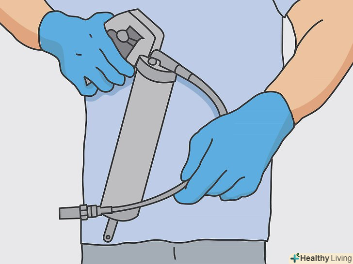 Прикрутіть назад кришку до корпусу шприца. закрутіть на два повних обороту, сильно закручувати не потрібно. Звільніть шток з поршнем із заблокованого положення і втисніть його в корпус, одночасно натискаючи рукоять на соплі шприца. Ця процедура дозволить вигнати повітря зі шприца і почати йому працювати нормально. Припиніть тиснути на рукоять, коли мастило з'явиться з сопла шприца.- Закрутіть одночасно кришку і корпус шприца. Натисніть на шток з поршнем, щоб перевірити, що він повністю взаємодіє з новим картриджем. Натисніть на рукоять і перевірте, що мастило виходить.