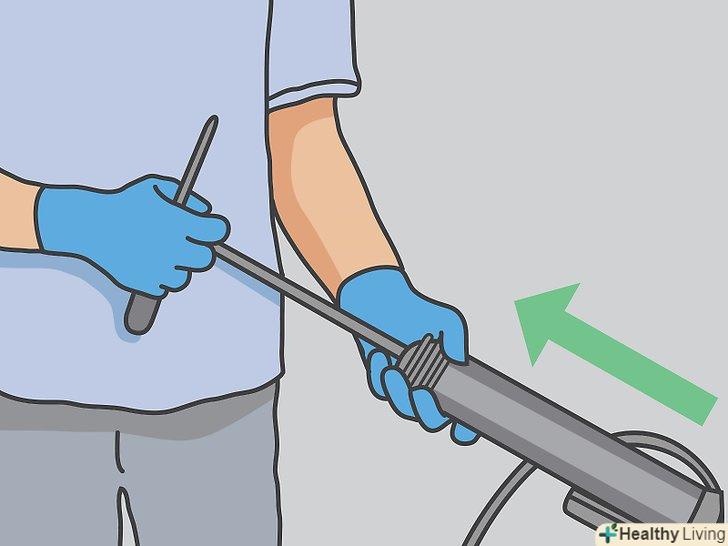 Відокремте голову шприца від корпусу. якщо у вас є мастило у великій ємності, то наповнення шприца буде більш ефективним. Для початку, відкрутіть голову від корпусу шприца. Голова це частина з рукояттю і трубкою-аплікатором. Відкрутіть їх від шприца і відокремте від корпусу.- Переконайтеся, що рукоятка з задньої частини шприца, яка є рукояткою штока, повністю втиснута всередину шприца, інакше ви ризикуєте випадково засмоктати мастило в шприц в процесі наповнення.