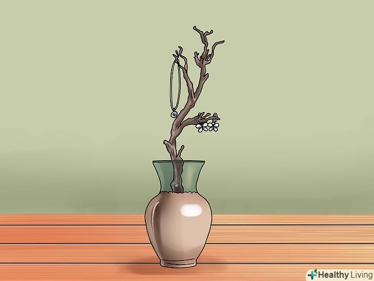 Зробіть дерево для біжутерії на свій комод. розставте кілька сухих гілок у вазі. Заповніть вазу галькою для стійкості. Прикрасьте дерево, розвісивши на гілках сережки, намиста і браслети.