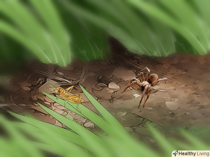 Врахуйте, що павук-вовк може полювати як вдень, так і вночі. більшість жертв павуків-вовків (цвіркуни, гусениці та інші комахи) зустрічаються як вдень, так і вночі. Якщо у вас на ділянці багато цих комах, то поруч може оселитися павук-вовк.- Зверніть увагу на швидкість бігу павука. павуки-вовки надзвичайно швидкі. Їх дуже важко зловити, тому що бігають вони дуже швидко.