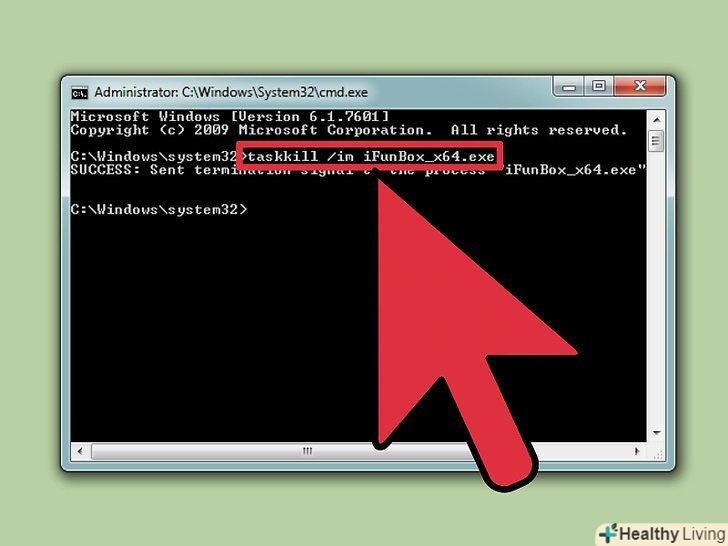 Закрийте завислу програму. у командному рядку введіть Taskkill / im filename.exe і натисніть ↵ Enter. Замість filename введіть ім'я зависла програми. Наприклад, якщо ви хочете закрити iTunes, введіть команду Taskkill /im itunes.exe.