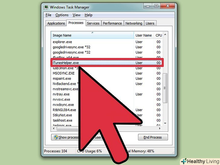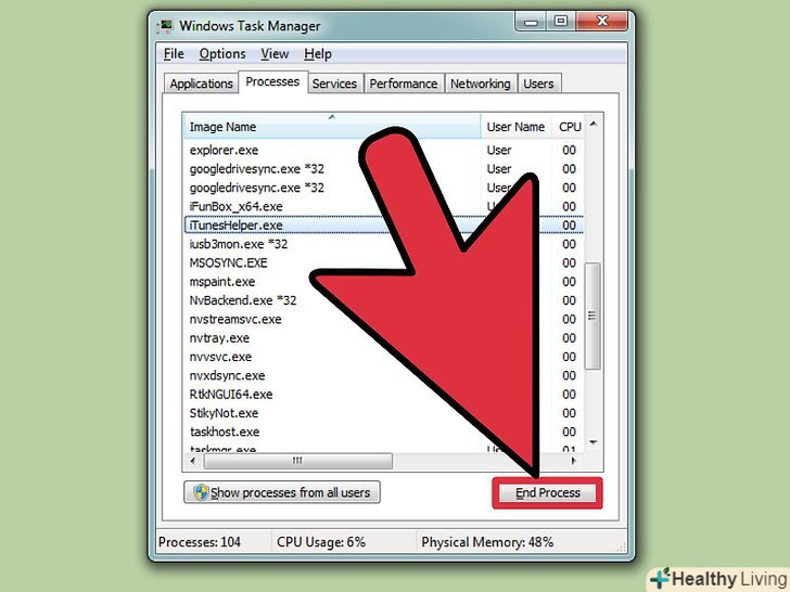Знайдіть і виділіть відповідний процес.на вкладці "Процеси «відображається набагато більше процесів, ніж Програм на вкладці» Додатки", так як враховуються процеси, що працюють у фоновому режимі. Можливо, вам доведеться витратити трохи часу, щоб знайти процес зависла програми.