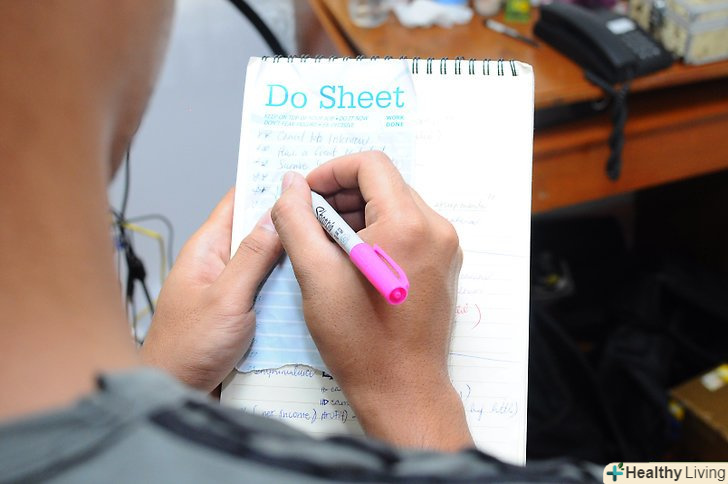 Складайте списки справ.- Складайте список справ на день. Ваш щоденний список справ повинен включати в себе не більше п'яти позицій, інакше ви візьмете на себе занадто багато і будете приречені на невдачу. Відзначте одну або дві справи як ті, що необхідно в обов'язковому порядку виконати в цей день, і працюйте над цими завданнями, поки не виконаєте їх повністю.