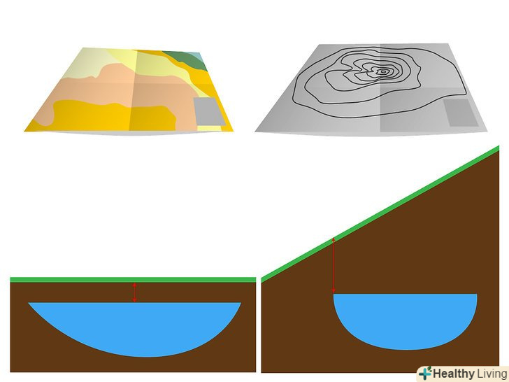 Звіртеся з геологічними і топографічними картами. вони дають менше інформації, ніж дані про буріння свердловин, але геологічні карти можуть показувати розташування водоносних пластів і скельні масиви місцевості. Топографічні карти відображають особливості поверхні ділянки місцевості і перепади висоти, і можуть бути використані для планування місця розташування свердловини. У сукупності, ці дані допоможуть визначити, чи є рівень грунтових вод достатнім для буріння свердловини.- Грунтові води розташовані на різному рівні, але в якійсь мірі повторюють рельєф. Найближче до поверхні вода знаходиться в долинах, особливо колишніх руслом річки або струмка; на височини ж досягти грунтових вод складніше.