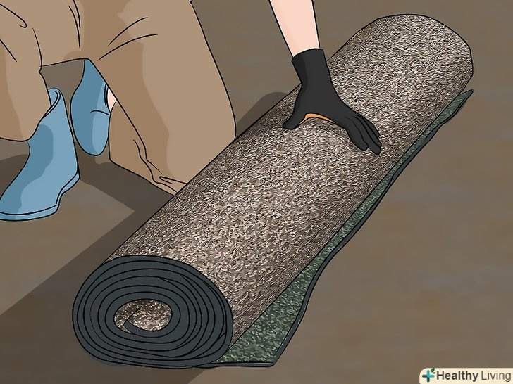 Відріжте смугу. коли ви складете килим, використовуйте ніж, щоб відрізати частину килима і згорнути його якомога рівномірніше. Навіть якщо це деформує частину килима, спробуйте згорнути його в маленький згорток – так буде легше нести. Використовуйте скотч, щоб закріпити кінець рулону, потім помічник бере один кінець, а Ви інший, і викидаєте його.- Зрештою, ви будете працювати з усім килимом таким основним способом. Підніміть секцію, розріжте її на смуги за допомогою ножа, і згорніть її. Це дозволить легше винести її з кімнати і розмістити де-небудь.