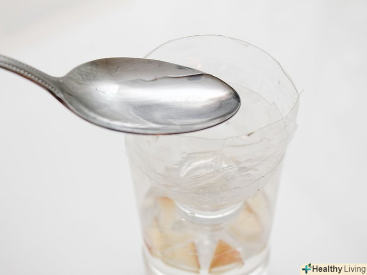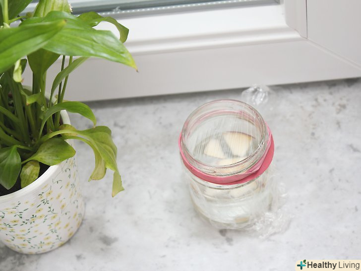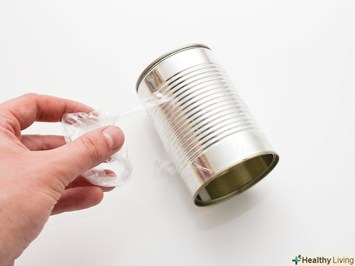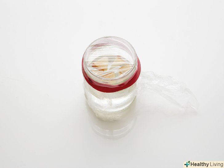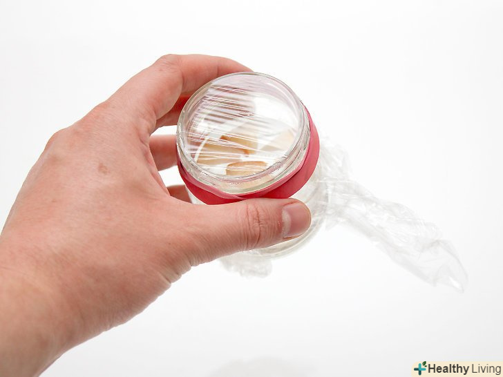 Накрийте банку харчовою плівкою. відірвіть шматочок не менше 7,5 на 7,5 сантиметрів. Щільно оберніть горло банки плівкою. Якщо плівка не буде триматися, закріпіть її скотчем або надіньте наверх гумку. [13]