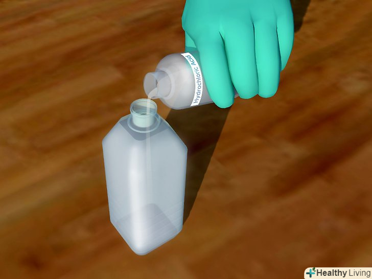 Налийте трохи хлористоводневої кислоти в пластикову пляшку. розчин хлороводневої кислоти в низьких концентраціях широкодоступний в господарських магазинах і зазвичай називається соляною кислотою. Обережно налийте близько 60 мл кислоти в міцний пластиковий флакон. При цьому необхідно використовувати гумові рукавички і захисні окуляри. [1]