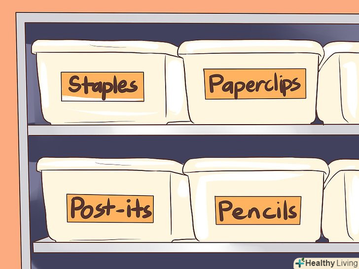 Використовуйте бирки. купіть або зробіть бирки для позначення речей. Бирки допомагають зручно організувати і швидко знаходити робочі приналежності. Можна використовувати принтер для друку етикеток або зробити написи вручну ручкою і маркером. [10]- Також бирки можна зробити за допомогою паперу і клейкої стрічки.