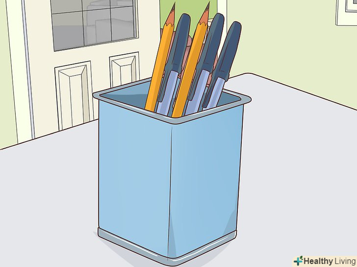Невеликі предмети для зберігання. використовуйте банки, невеликі коробки, ящики і посуд для зберігання дрібних речей. Скляна банка стане відмінною підставкою для ручок і олівців. Їх можна зберігати на столі. У невеликі ємності можна скласти шпильки і бісер. На маленьких тарілках можна розташувати невеликі дрібнички і декоративні елементи. [8]- Використовуйте кожну ємність тільки для одного типу речей. Наприклад, Зберігайте ручки окремо від олівців в різних банках.