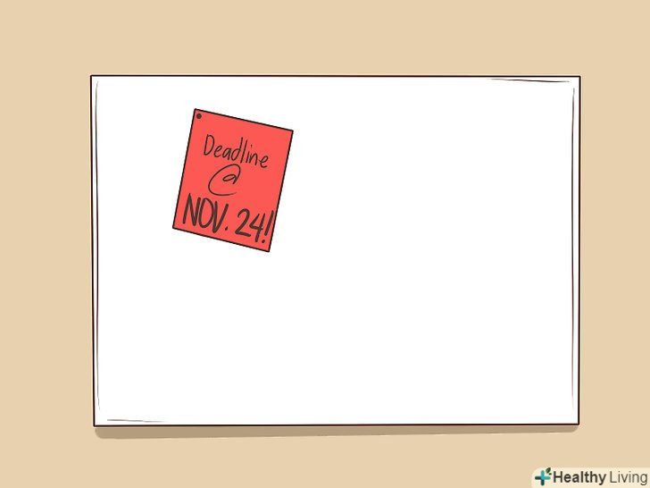 Закріпіть дошку. повісьте на стіну біля столу дошку для організації ідей і матеріалів. Вона може стати вашою дошкою візуалізації або місцем для зберігання нагадувань. Найкраще підійде коркова плита, але також можна використовувати щит, покритий тканиною. Зображення або зразки можна прикріплювати за допомогою кнопок або шпильок. [9]- Дошка візуалізації відмінно підійде для організації нотаток, зображень і зразків тканини для нинішніх і минулих проектів.