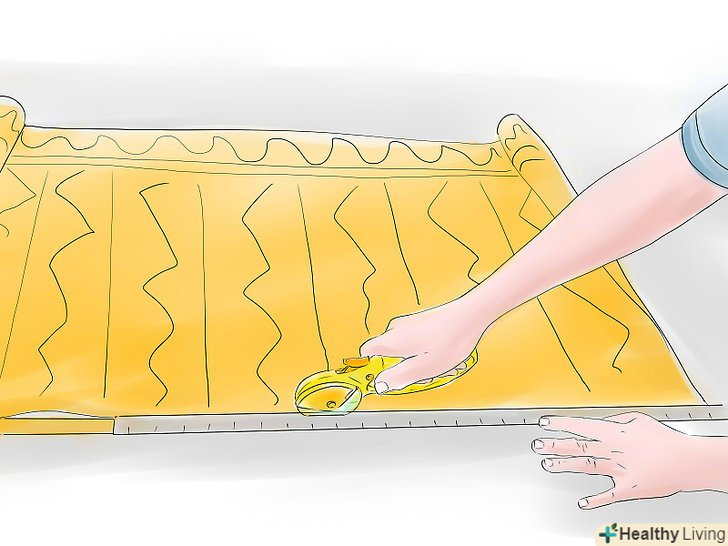 Наріжте шпалери. не забувайте про крок малюнка, якщо потрібно підганяти візерунок.- Нарізайте спочатку цілісні смуги. Вставки - вже після наклеювання основних великих смуг.