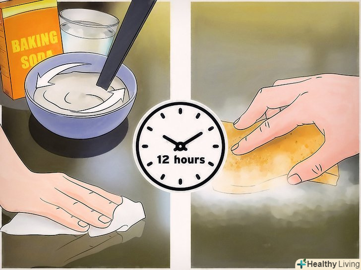 - В якості більш безпечної альтернативи спробуйте видалити плями від води за допомогою пасти з білого оцту і харчової соди. Залиште суміш на плямі на одну годину, після чого злегка потріть поверхню і вимийте її чистою водою. Додайте в воду краплю рідкого мила або перекису водню, щоб краще очистити поверхню. [6]