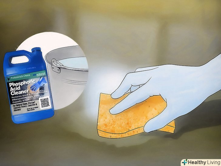 Спробуйте використовувати ортофосфорну кислоту (засіб для виведення іржі), щоб видалити стійкі плями від води. ця кислота становить небезпеку, тому будьте обережні при поводженні з нею. Розведіть кислоту водою-таким чином ви послабите її, і вона не зашкодить скловолокно. [5]- Розбавте засіб для видалення іржі водою приблизно до 10 %, щоб зробити його менш небезпечним. Обережно перемішайте розчин, перш ніж наносити його на поверхню скловолокна.