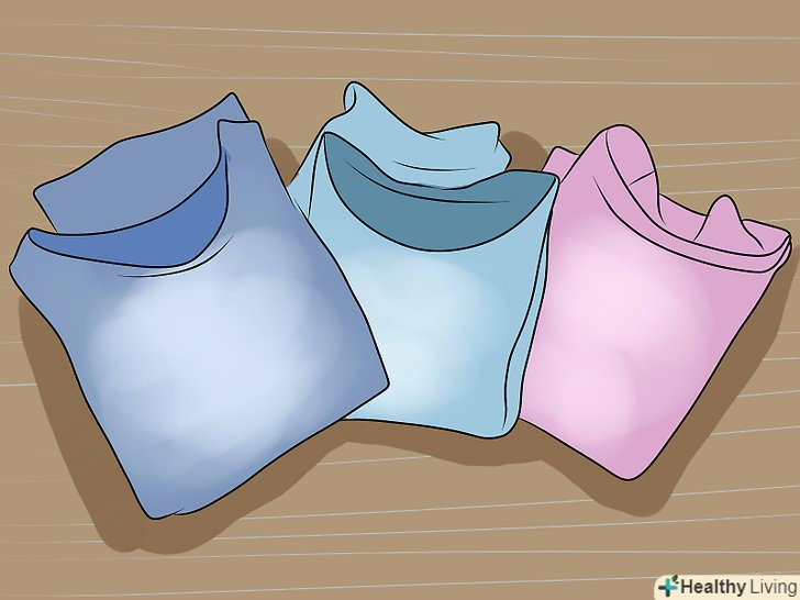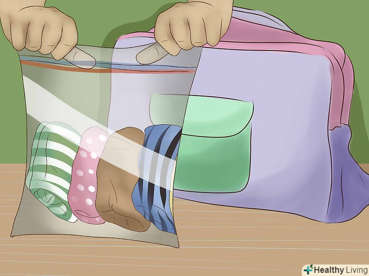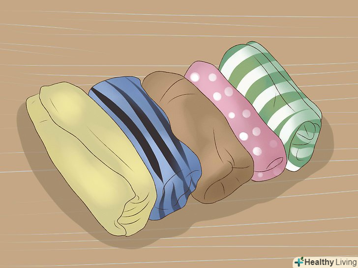 Створіть Нічний набір. Ви можете зробити зручний сувій нічного одягу, згорнувши її в купу. Покладіть домашню футболку на ліжко. Складіть вашу нижню білизну і кілька піжамних штанів приблизно на 10х10"площі і розмістіть цей квадрат вгорі на комірі футболки. Складіть ліву сторону футболки, а потім праву, так що у вас вийде довгий трикутник. Тепер Покладіть ваші шкарпетки горизонтально у верхній, центральній частині (де лежить білизна). Шкарпетки відкритим кінцем повинні виглядати назовні і стирчати на кілька сантиметрів від краю футболки. Тепер, скачайте футболку, поклавши всередину в рулон зубну щітку та інші туалетні приналежності, які захочете. Як тільки отримаєте рулон, закатайте краю шкарпеток на його кінці, щоб створити хорошу, щільну пачку. [2]- Можна зробити кілька пачок для більш тривалої поїздки за таким же методом, щоб зберігати окремі речі для конкретних днів, позбавляючи вас від необхідності копатися в сумці через потрібну пару шкарпеток.