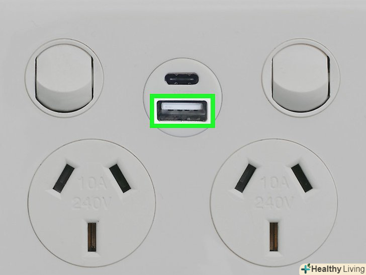 Підключіть зарядний кабель пристрою до джерела живлення.Вилку кабелю застроміть в електричну розетку. Інший кінець кабелю зі штекером, аналогічним штекеру для навушників, залишиться вільним.- Щоб зняти вилку (перехідник для розетки) з кабелю, потягніть за прямокутний штекер, який підключений до вилки. Тепер кабель можна підключити до USB-порту комп'ютера.