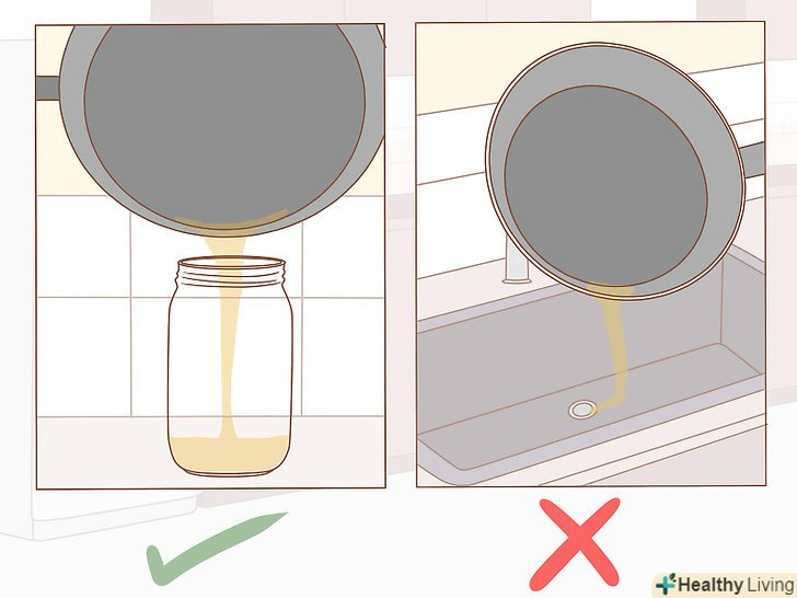 Збирайте масло і жир в ємність. збирайте кулінарний жир в банку, пляшку або іншу ємність, яку не шкода викинути. Не виливайте гаряче масло або розтоплений жир прямо в слив раковини. Це призведе до проблем з трубопроводом. Завжди утилізуйте кулінарний жир в окремій ємності. [11]- Повну банку можна викинути з рештою сміттям. Вона непридатна для повторного використання.