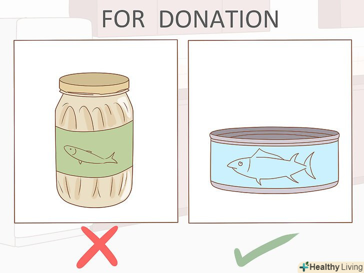 Визначте відповідні продукти. якщо полки ломляться від продуктів, які ви не плануєте з'їсти, то необов'язково викидати їжу в сміття. Віддайте їжу в місцеві благодійні організації на зразок продовольчого фонду або кухні для бездомних, щоб продукти харчування не пропадали даремно. В цьому випадку спочатку потрібно відсортувати відповідні продукти.- Як правило, можна віддати все непсувні продукти на зразок консервованих овочів, супів, риби і м'яса.
