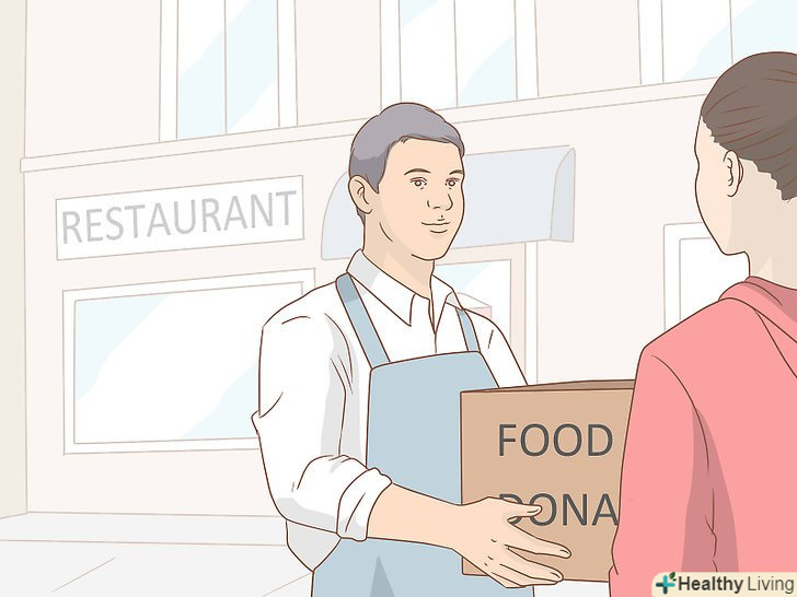 Жертвуйте продукти з ресторану. власники ресторанів також можуть жертвувати зайву їжу на благодійність. Зв'яжіться з місцевим благодійним центром і уточніть деталі, після чого працівники організації приїдуть забрати приготовані вами продукти. Такий спосіб також дозволяє віддати швидкопсувні продукти і готові страви, які можна відразу ж заморозити або передати в їдальню для бездомних. [8]- Список організацій завжди можна знайти в телефонному довіднику або онлайн.